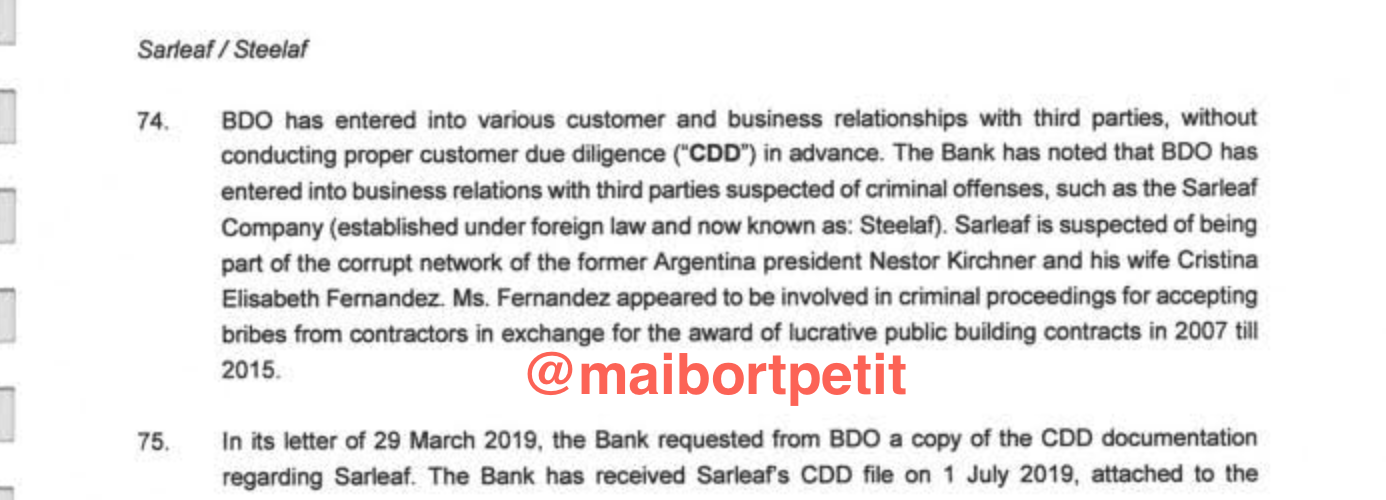 El BDO entabló relaciones comerciales con terceros sospechosos de cometer delitos penales sin cumplir con la diligencia debida por adelantado. Es el caso de la Sarleaf Company (establecida en virtud de la ley extranjera y ahora conocida como: Steelaf). Se sospecha que Sarleaf forma parte de la red corrupta del expresidente argentino, Néstor Kirchner, y su esposa, Cristina Elisabeth Fernández (electa como vicepresidente de Argentina en las elecciones de Octubre de 2019). «Fernández parece estar involucrada en procesos penales por aceptar sobornos de contratistas a cambio de la adjudicación de lucrativos contratos de construcción pública en 2007 hasta 2015», dice el informe.