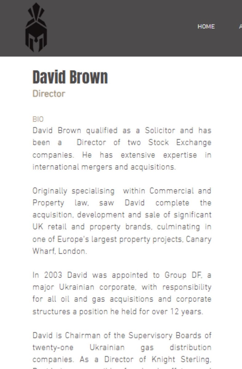 Brown es presidente de los consejos de supervisión de veintiún empresas distribuidoras de gas de Ucrania. Como director de Knight Sterling, David Brown es en esa firma, responsable de los asuntos legales y la gobernanza.