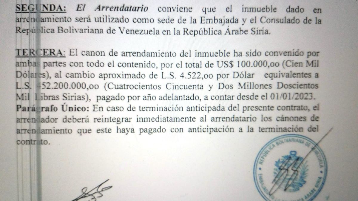 Una fuente comentó que este es uno de cuatro contratos de arrendamiento que posee la Embajada y el Consulado venezolano en Siria, sin ofrecer mayores detalles al respecto.