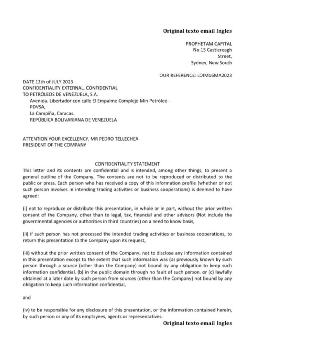 Otra carta marcada como confidencial, enviada por la empresa Prophetam Capital, con sede en Sydney, Australia, a la empresa petrolera estatal venezolana Petróleos de Venezuela S.A. (PDVSA), tiene fecha del 12 de julio de 2023 y está dirigida al Presidente de PDVSA, Sr. Pedro Tellechea. Lleva la referencia «LOIM16MA2023».