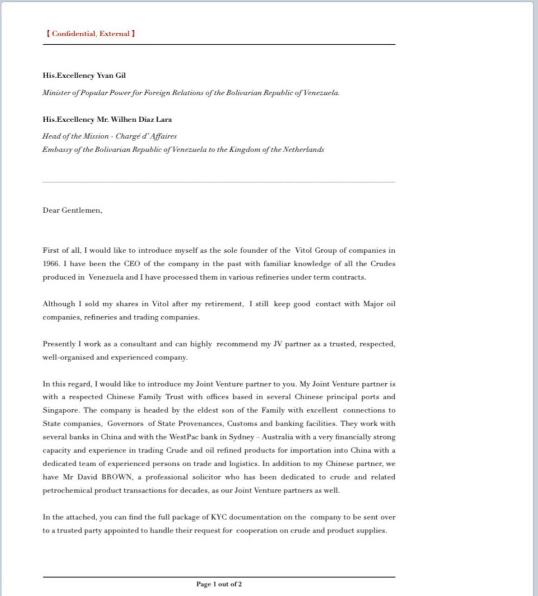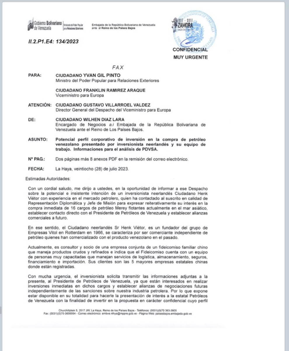 En otra carta, Henk Viétor, quien asegura haber sido fundador y CEO de Vitol Group, se presenta ante el Ministro de Relaciones Exteriores de Venezuela, Yvan Gil, y el Encargado de Negocios de la Embajada de Venezuela en los Países Bajos, Wilhen Díaz Lara.